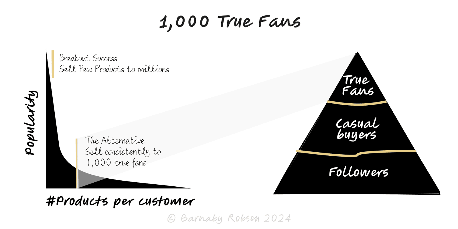 Scale variants – “100 True Fans” (high ARPU) and “10,000 True Fans” (low ARPU) are the same mechanism with different unit economics.
