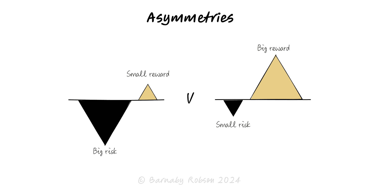 An asymmetry exists when the pay-offs, power, information or time horizons of two sides aren’t balanced. Strategy seeks convex situations (“heads I win big, tails I lose small”) and rejects concave ones (“small gains, rare ruin”). You can also manufacture asymmetry—through data, distribution, contracts, product economics, or option-like tests.