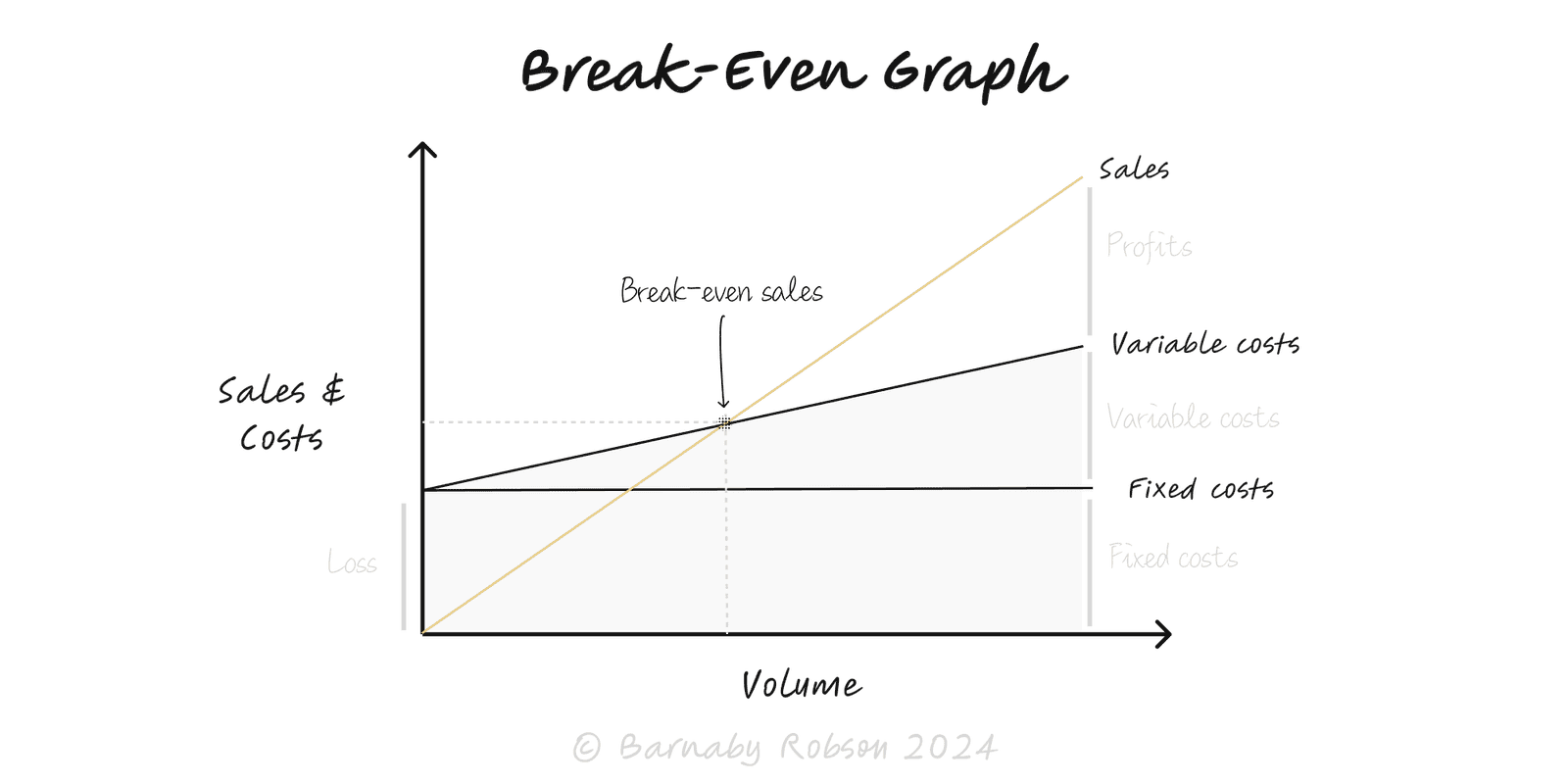 The break-even graph is the classic cost–volume–profit view. It plots total revenue and total cost against units sold. Their intersection is the break-even point (no profit, no loss). With a few inputs you can test prices, cost changes and sales targets, and see how fast profit grows after break-even (operating leverage).