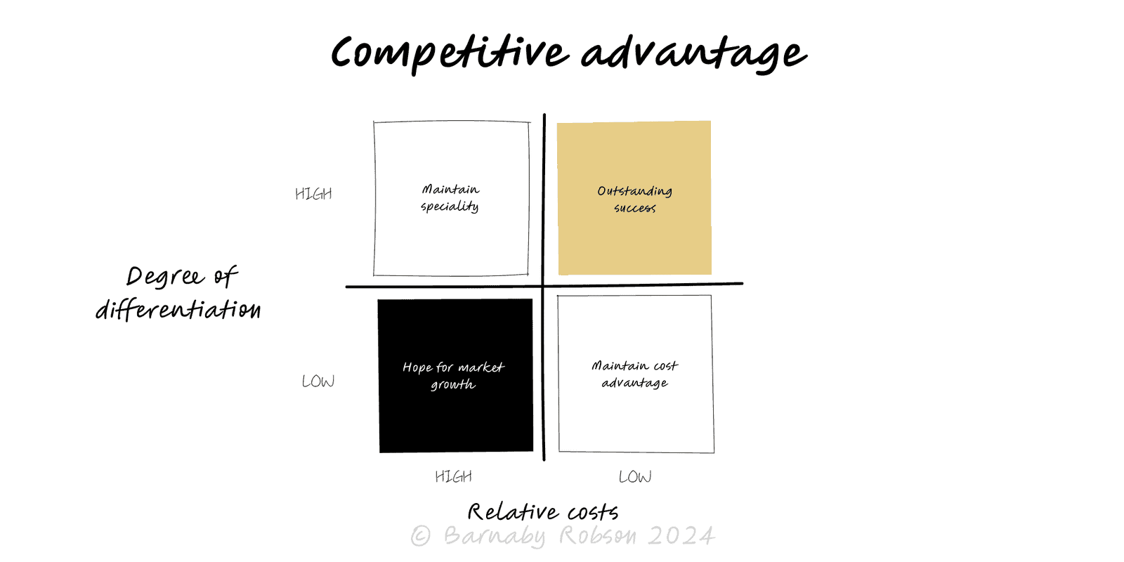You have competitive advantage when, for a given segment, your willingness-to-pay minus cost beats competitors. There are two basic routes: raise WTP (differentiation) or lower cost (efficiency) — ideally both for your target. Advantage endures only if it is hard to copy, so design choices, assets and incentives that slow imitation matter as much as the initial win.