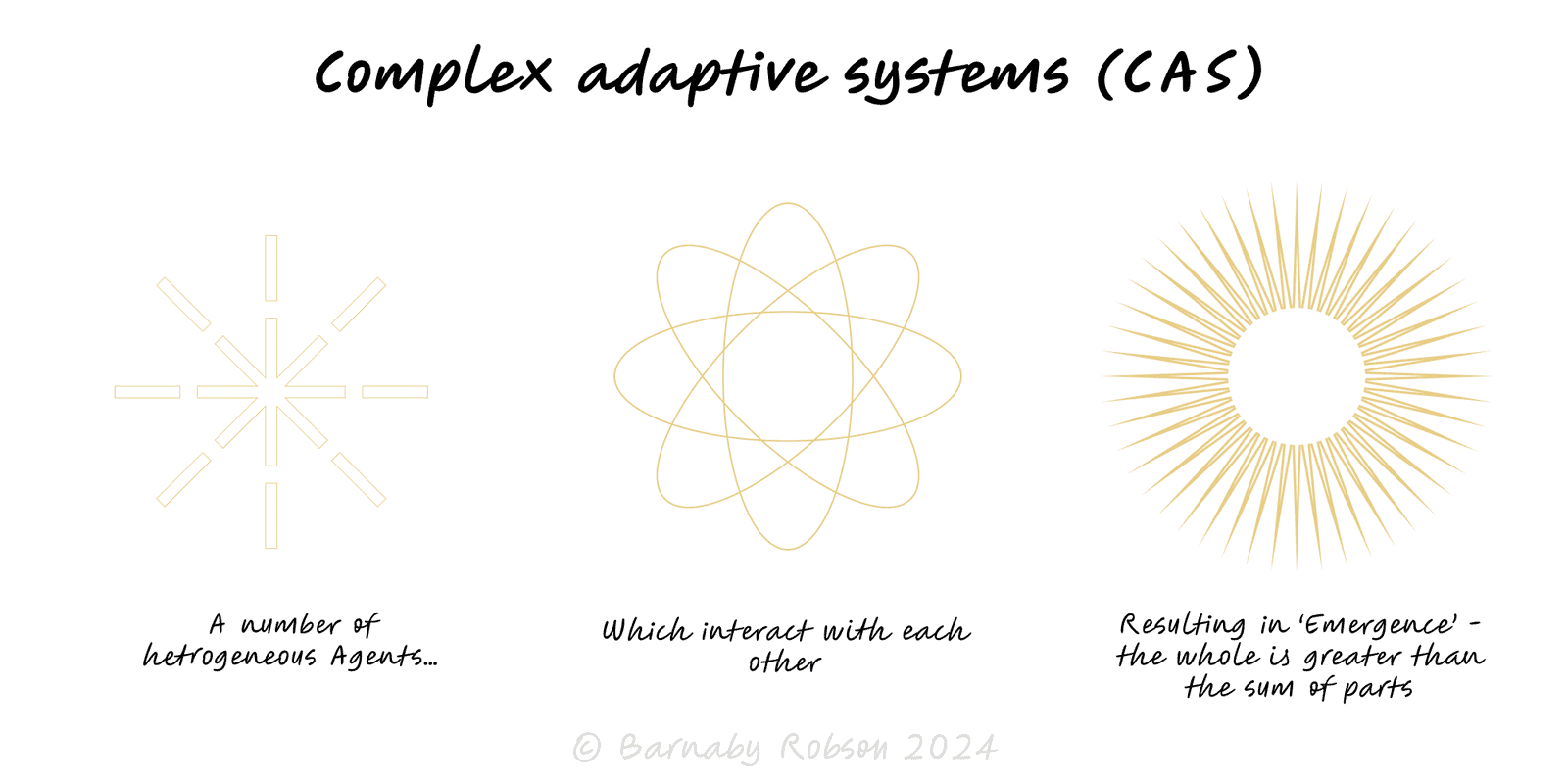 A complex adaptive system (CAS) is made of many agents (people, teams, firms, microbes, services) that learn and adapt as they interact. Because interactions are non-linear and full of feedback, the whole system shows patterns you can’t predict by inspecting parts alone (emergence). The practical move is to design conditions—rules, incentives, network links, guardrails—so desirable patterns are more likely to appear and persist.