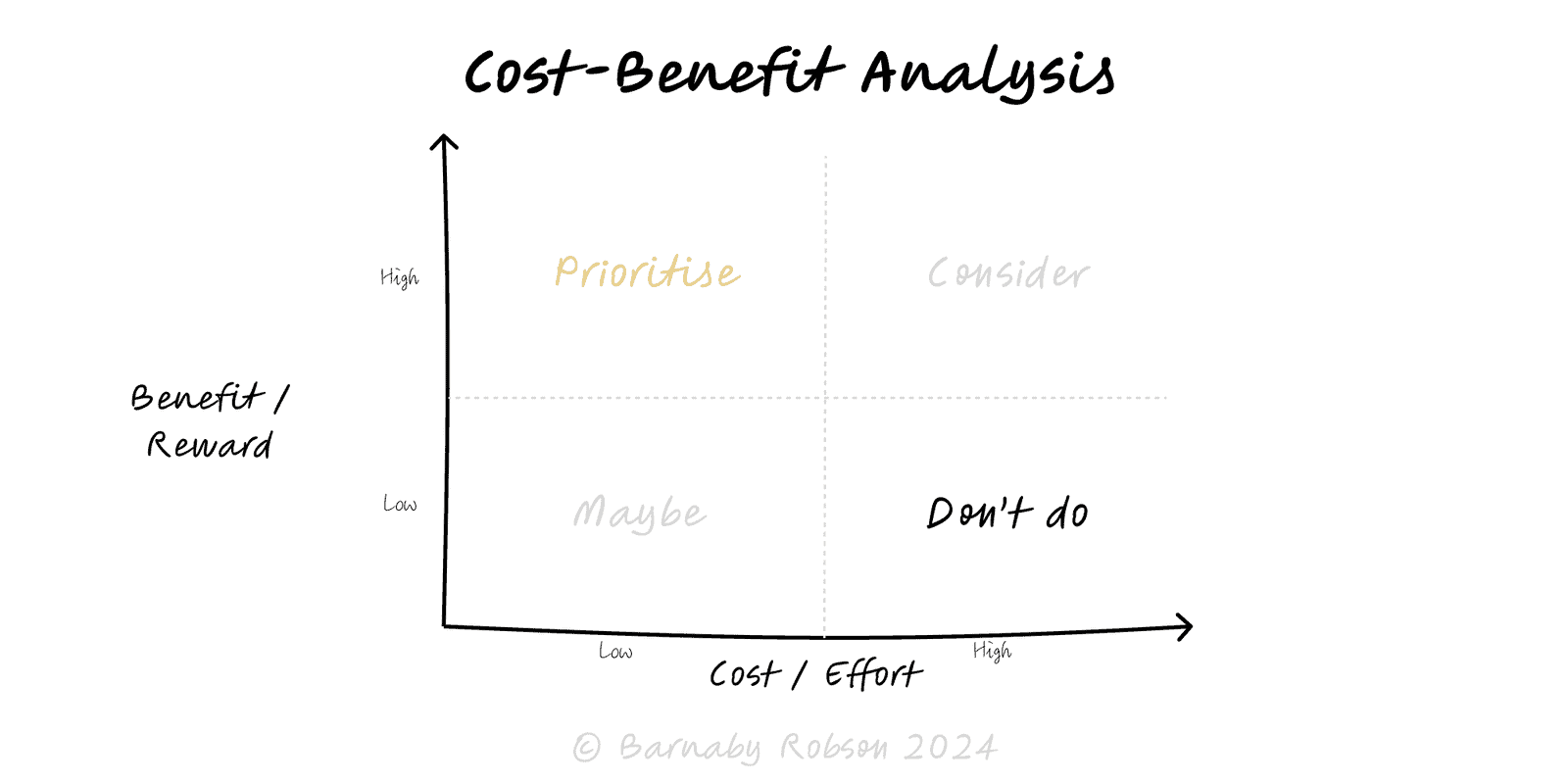 • High benefit, low cost — Prioritise: quick wins and high-leverage moves.