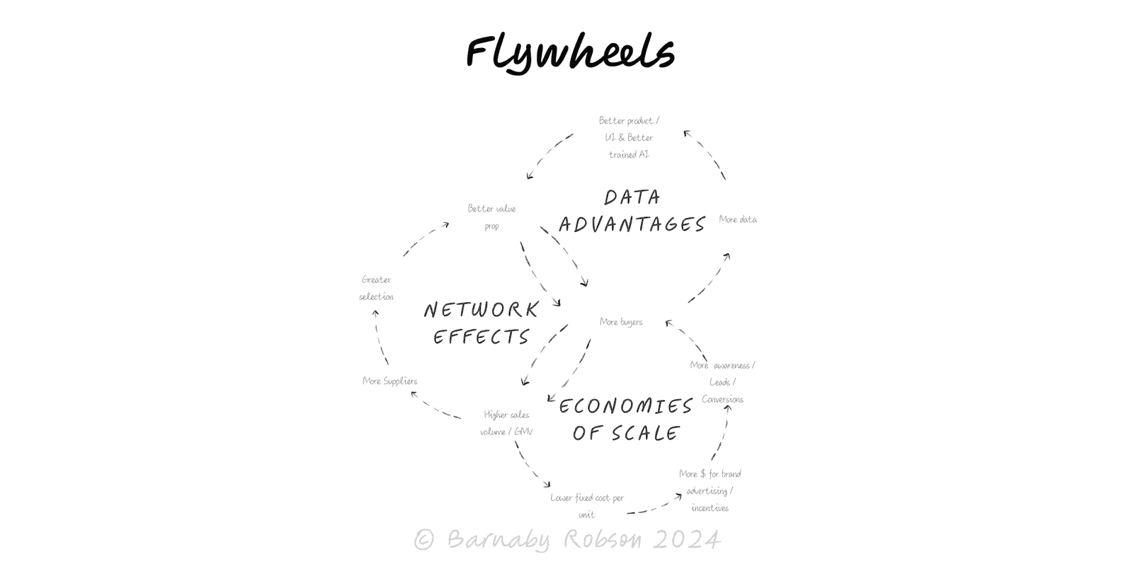 Marketplaces – more supply → better choice → more demand → attracts more supply.
