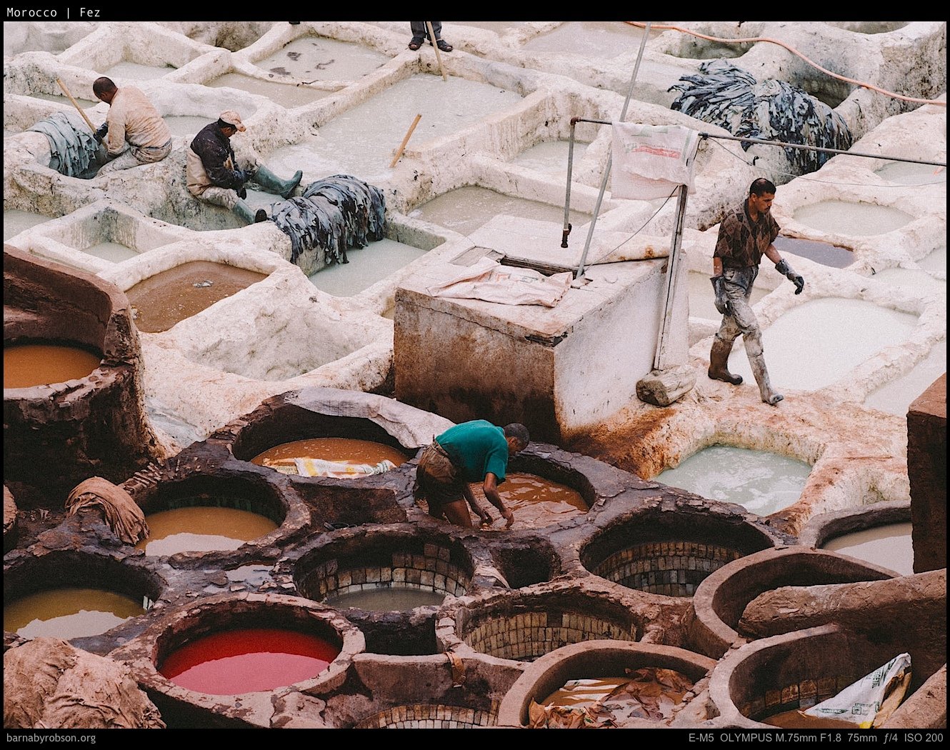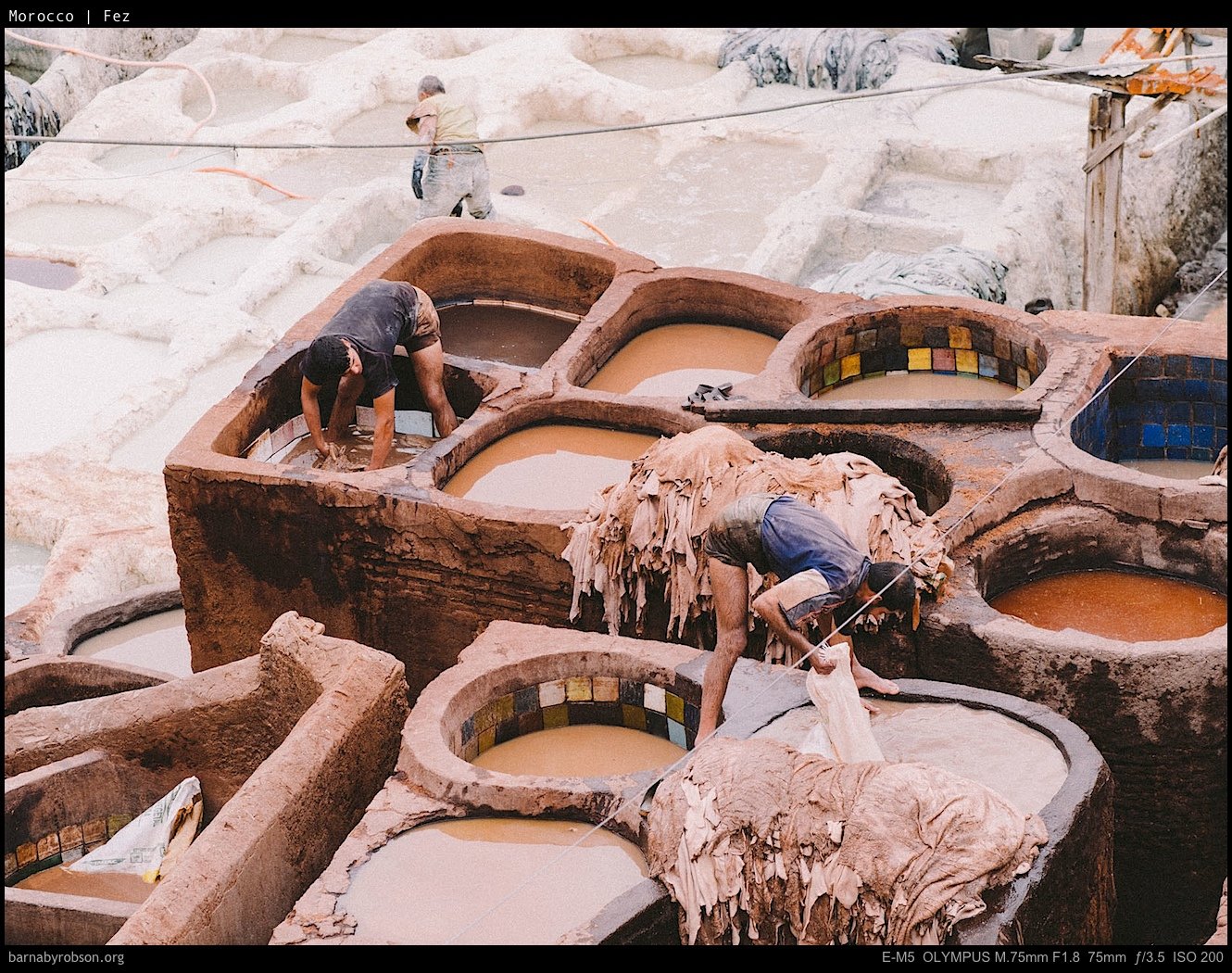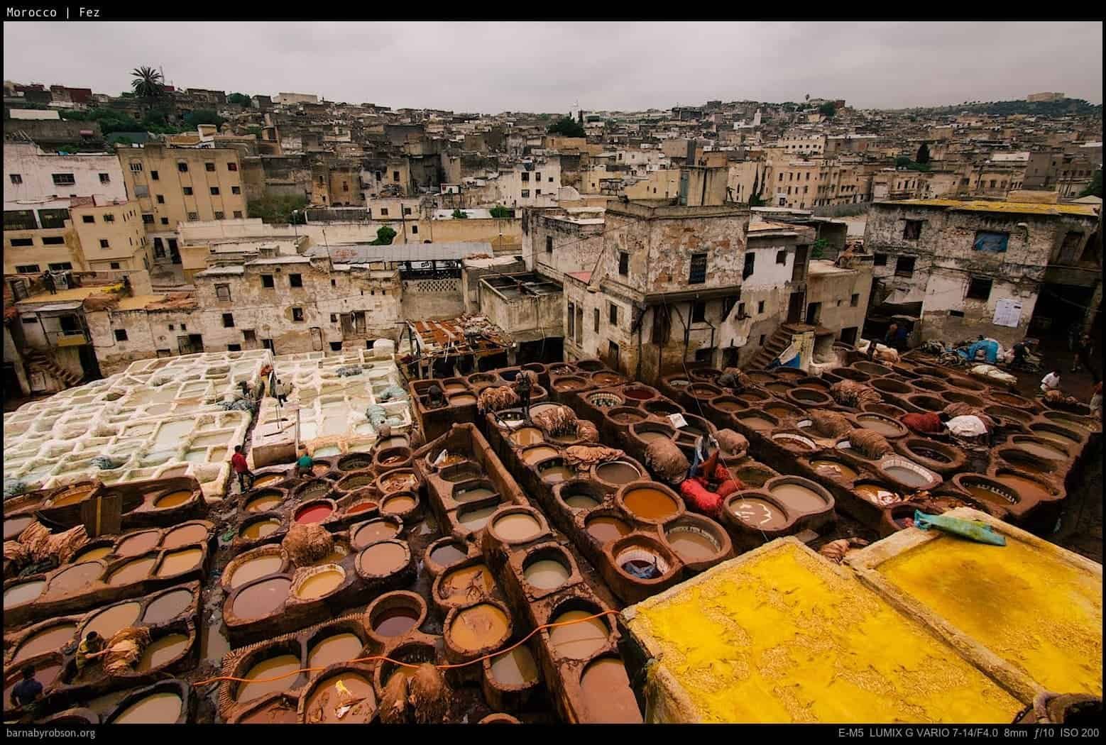 These frames focus on the tanneries and the old town — craft, texture, and daily trade rather than set-piece monuments.