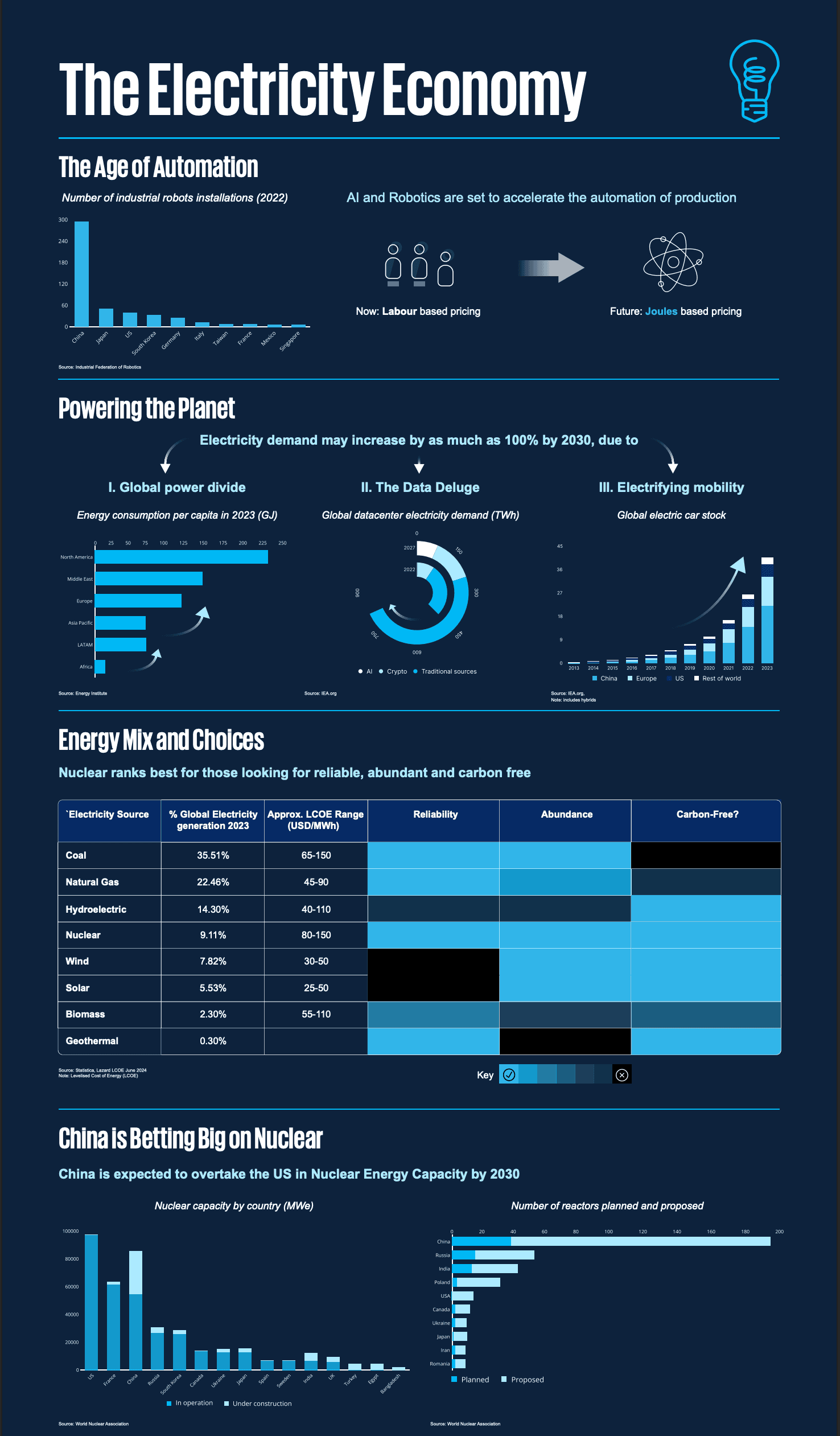 Explores the rising strategic importance of cheap, secure and reliable electricity as a driver of global competitiveness amid surging demand from emerging markets, data centres and transport electrification. Highlights nuclear power — particularly small modular reactors (SMRs) — as a critical baseload solution, and analyses growing M&A activity in the nuclear sector, including the increasing role of institutional and strategic investors.