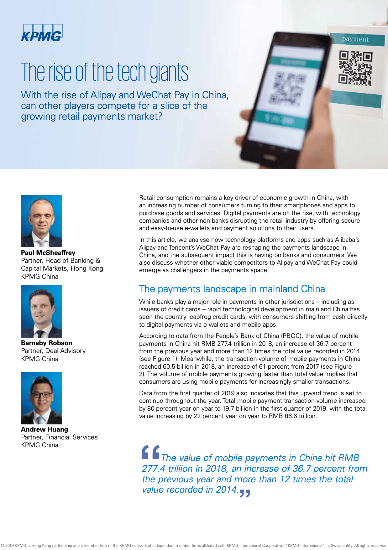 This article analyses how technology platforms and apps such as Alibaba’s Alipay and Tencent’s WeChat Pay are reshaping the payments landscape in China, and the subsequent impact this is having on banks and consumers. We also discuss whether other viable competitors to Alipay and WeChat Pay could emerge as challengers in the payments space.